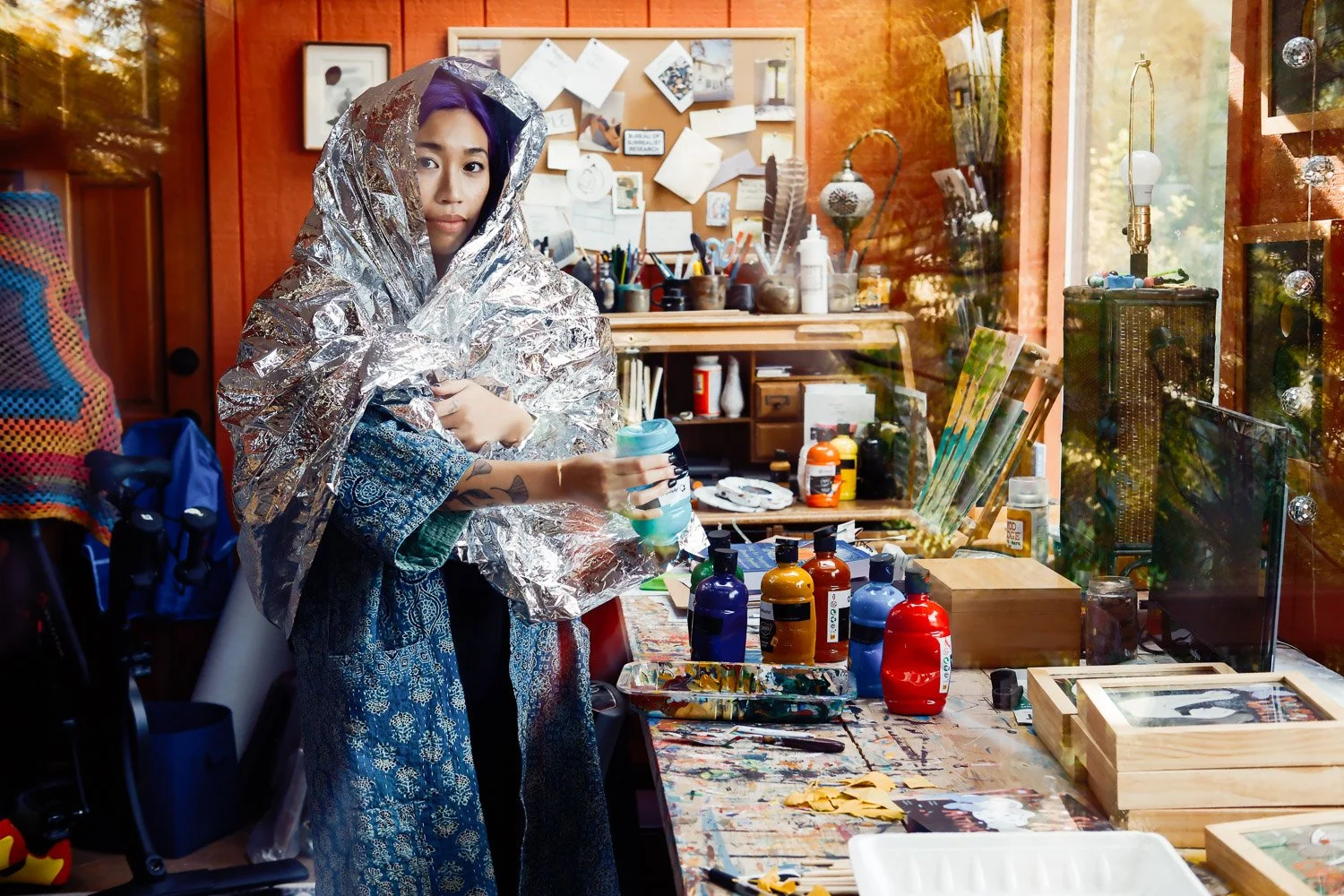 I love how odd this photo is. I shot it through a sliding glass door, so you can see the trees reflecting back, creating a layered, disorienting image that makes you wonder, what’s going on? But again, the space blanket becomes too distracting. And I gave up on the blanket altogether.