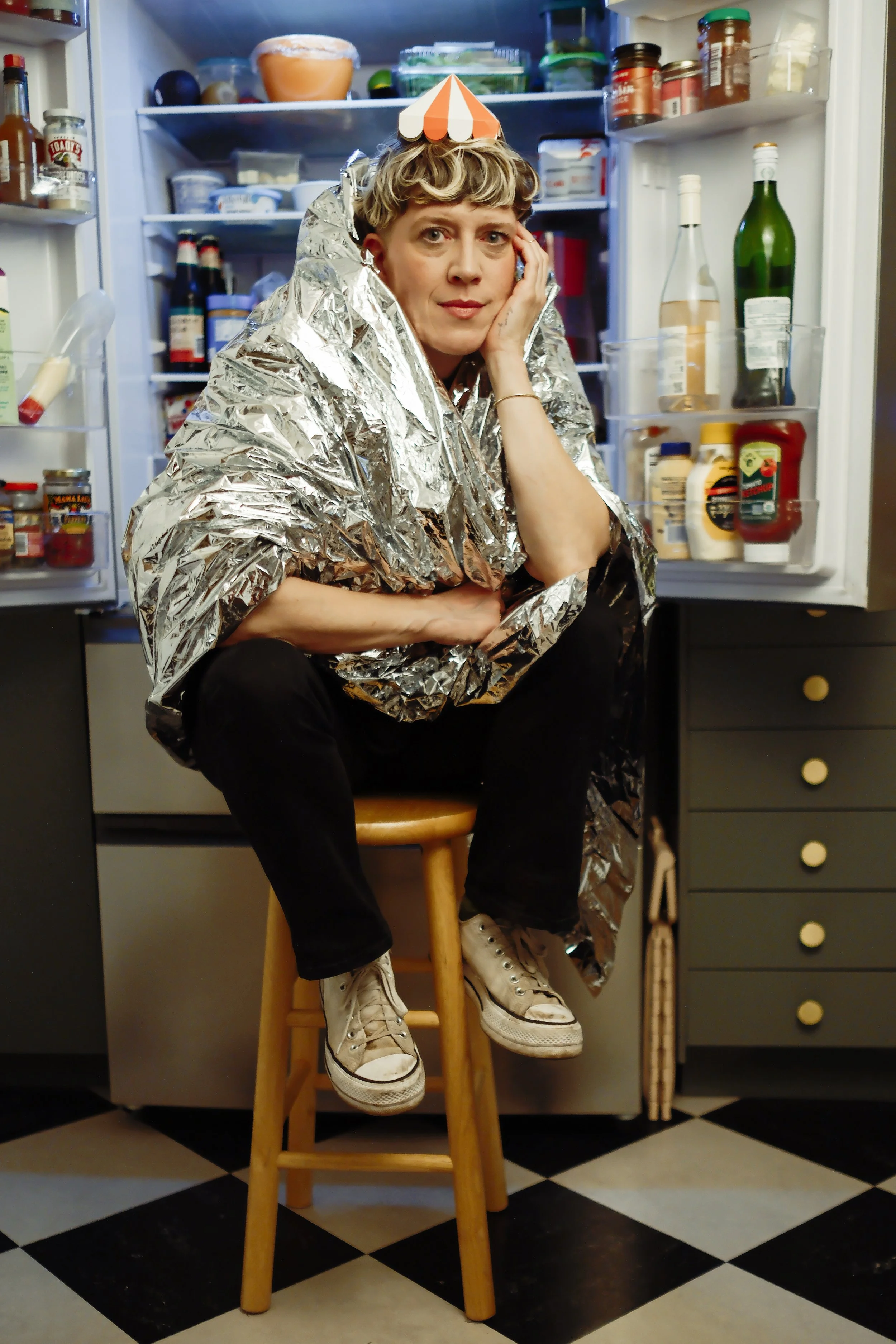 But what didn’t connect with others was the metallic blanket wrapped around my subject. I was trying to imitate literal leftover food being wrapped up in foil, tossed to the back of the fridge, and forgotten. The circus tent hat was added to this image by my friend because she thought it was funny, and I felt it was authentic to her. In the end, my professor and the rest of my class saw it as an emergency blanket and kept asking me, “Where’s the emergency? Is there an emergency?”